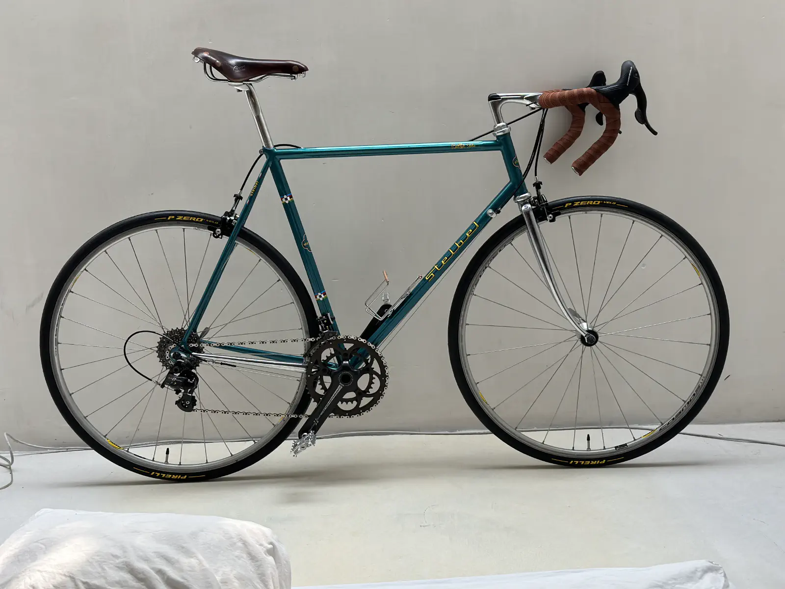 A piece of Italian cycling history. Built with Oria's distinctive star-shaped tubing for aerodynamic advantage and torsional stiffness. Aerodynamic bottom bracket shell. Stelio Belletti was among the first in Italy to use TIG welding for bicycle frames, patenting the technique in 1975. The Polish national team won gold at the 1975 Mettet world championships on Stelbel bikes. Stunning teal with gold decals.